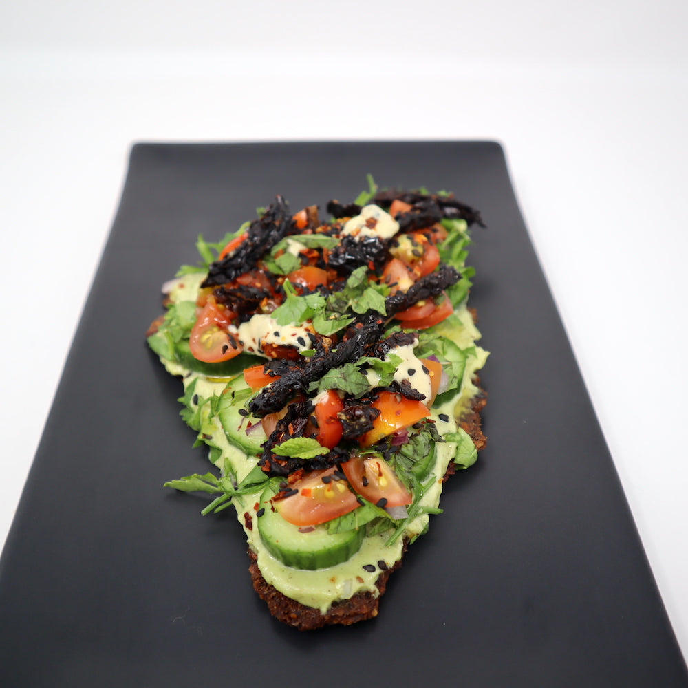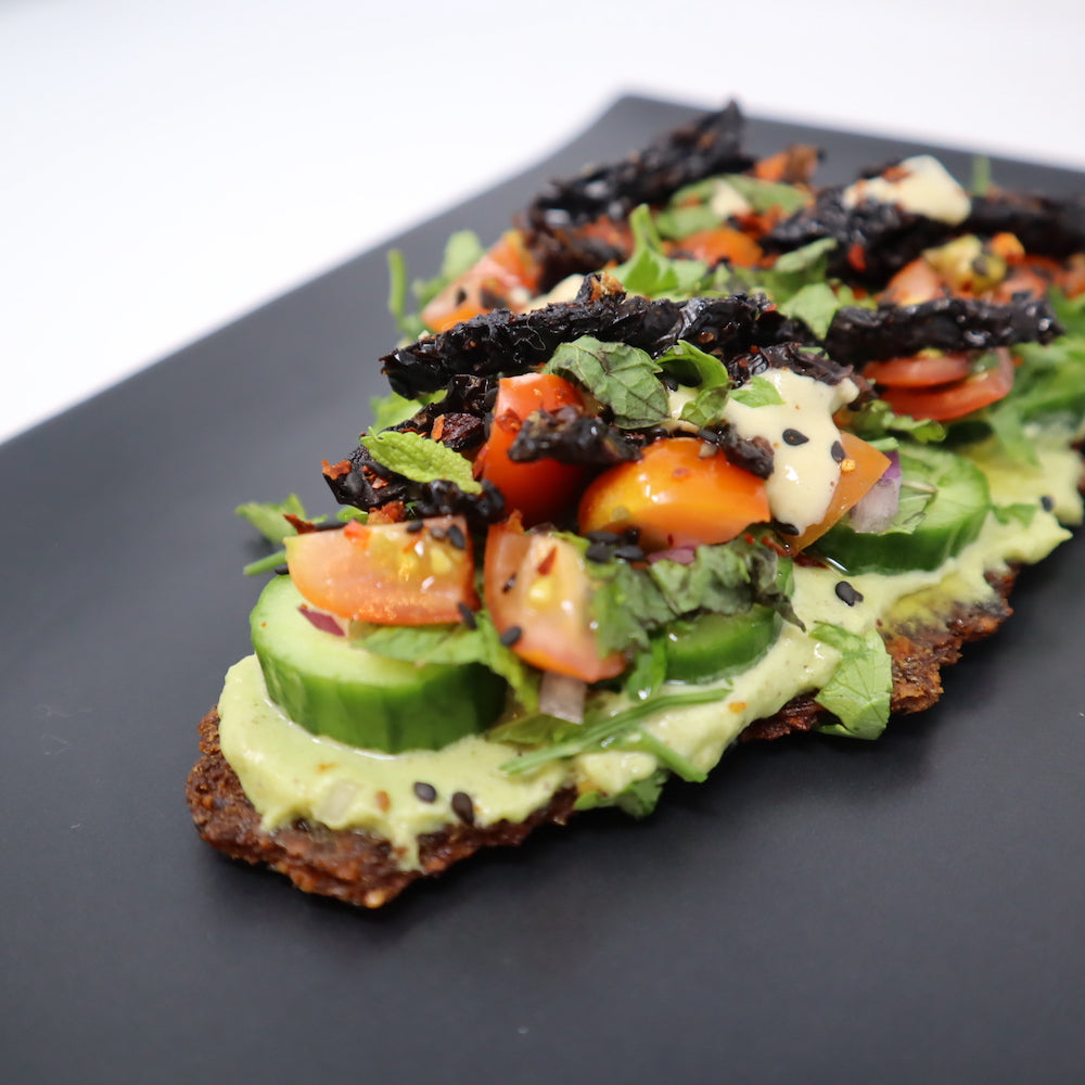 Paleo Pizza cracker, Green Nut hummus, cucumber, tomato, sun-dried tomato, mint, parsely, sesame seeds, red pepper flakes, olive oil